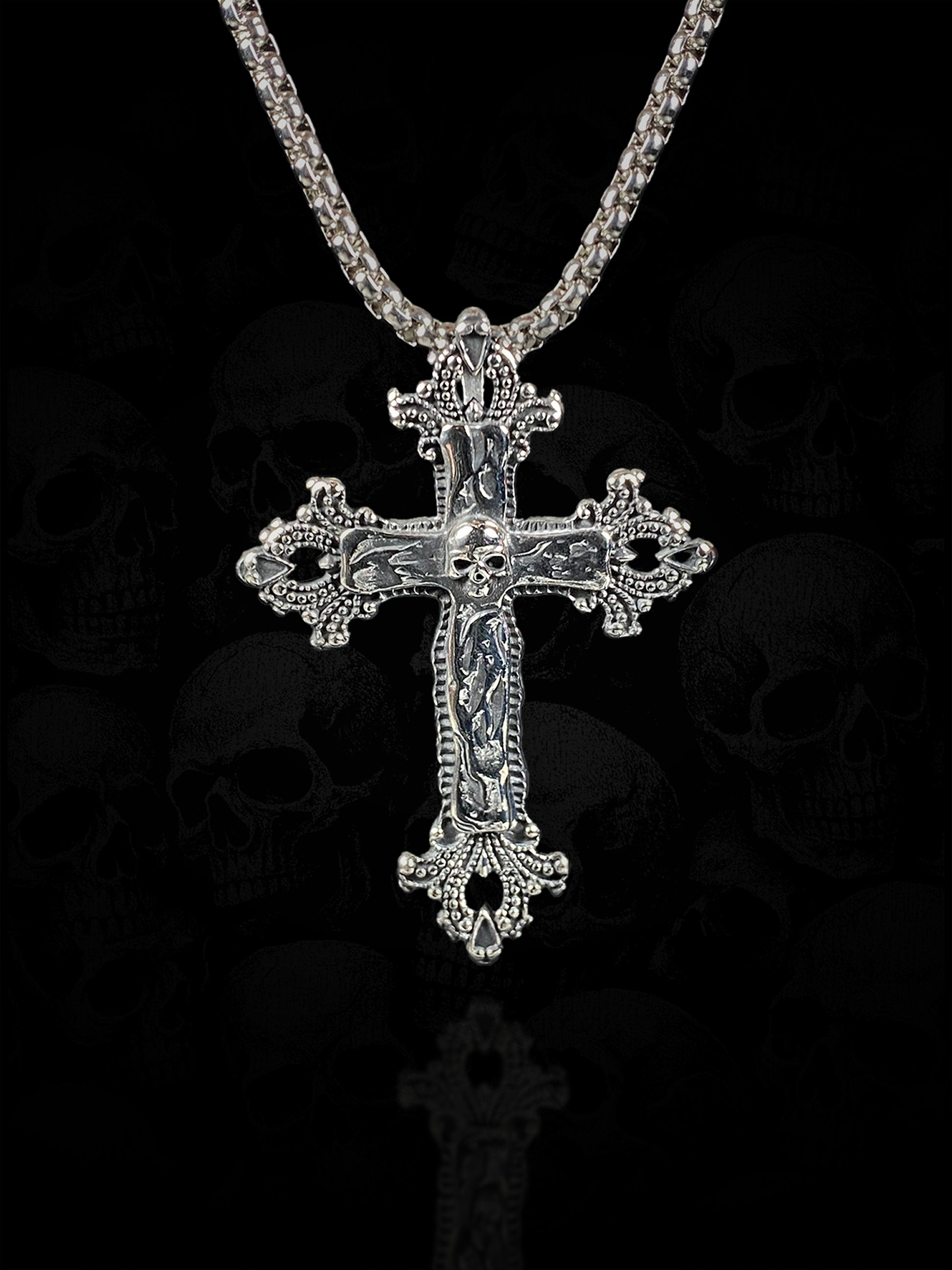 A baroque cross carved in solid stainless steel, built with sharp detail and a skull set at the center. The metal holds its weight, doesn’t fade, and keeps its shape through whatever you put it through. The design is intricate without feeling delicate. A piece made to outlast you.