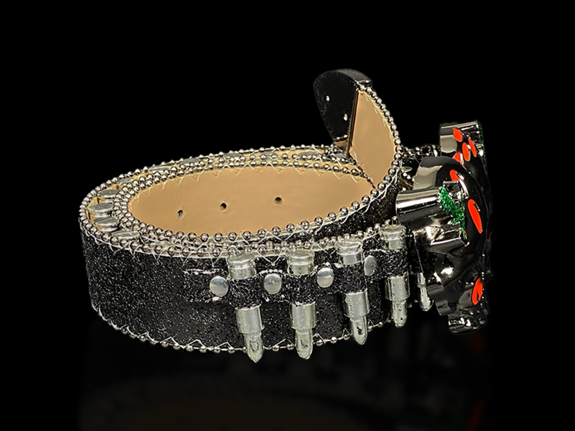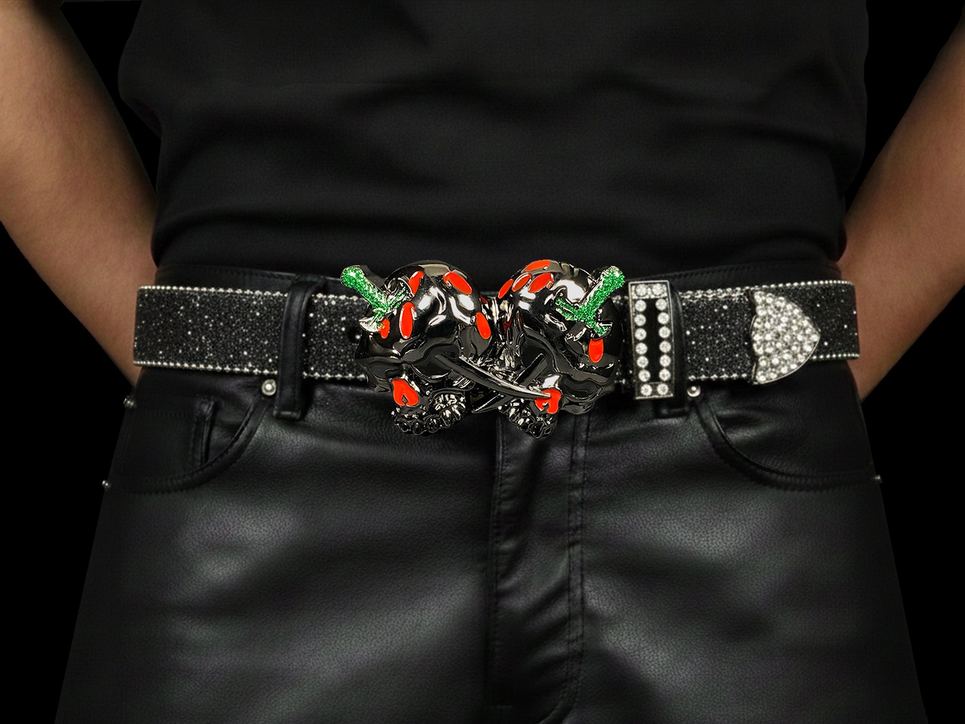 Alloy skull buckle set with bright enamel marks and crossed blades. Built to hit loud without feeling cheap. The strap is glitter PU leather wrapped clean around the waist, finished with stacked bullet hardware. The whole piece feels deliberate. Aggressive. Made to survive nights that drag on longer than they should. Quality that will outlast you.
