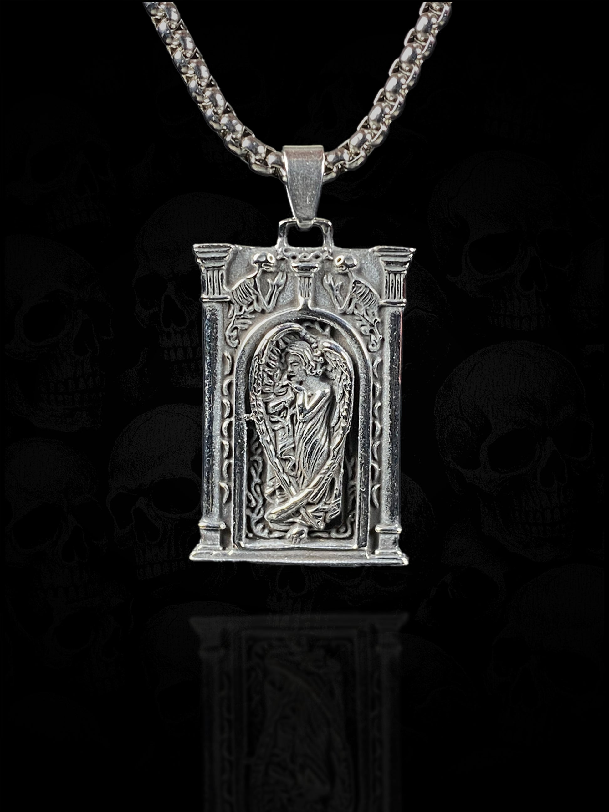 A cathedral gate cast in solid stainless steel, carved with worn pillars and a lone figure set behind the arch. The piece carries weight and grit, built with detail that feels intentional rather than decorative. Nothing delicate. Nothing pretending. Quality made to outlast you.