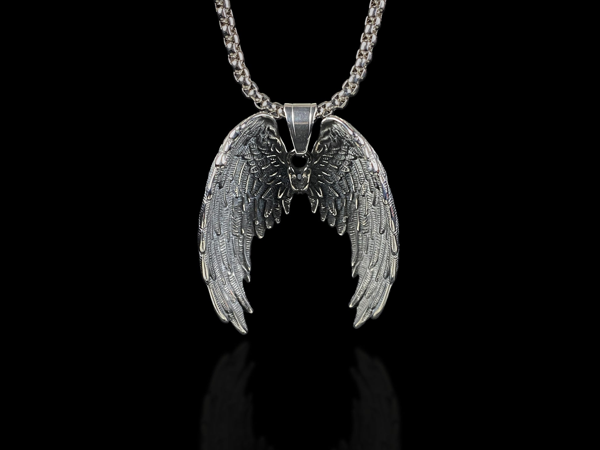 A pair of fallen wings cast in solid stainless steel, carved with sharp feather detail and a weight that feels intentional. The metal doesn’t fade, doesn’t bend out of shape, and doesn’t pretend to be delicate. Wings that look broken in but built to last longer than you do.