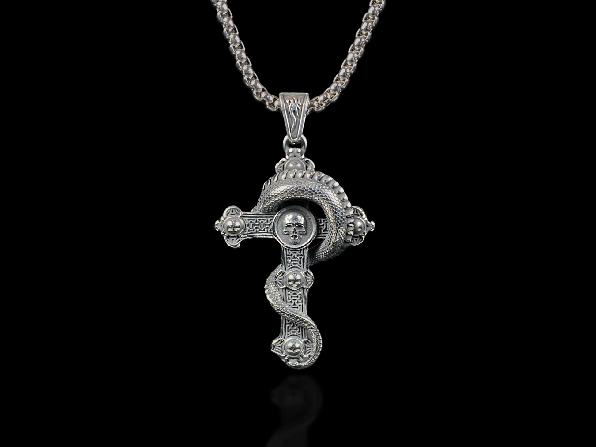 A serpent coiled around a carved cross, cut in solid stainless steel with enough detail to feel alive. The skull at the center anchors the piece, the stones at each point hitting with a sharp glint. It doesn’t fade, doesn’t bend out of shape, and doesn’t pretend to be delicate. A piece made to outlast you.
